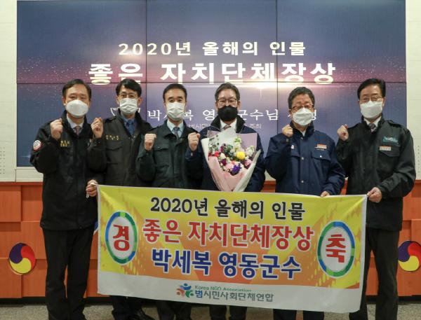 박세복 영동군수가 주민 복지향상과 지역발전과 이끈 공로로 범시민사회단체연합 주관의 올해의 인물 ‘2020년 좋은 자치단체장’에 선정됐다.