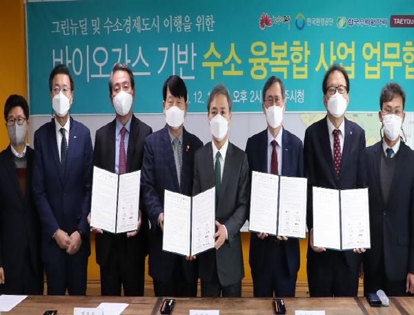 전주시와 한국환경공단, 한국수력원자력㈜, ㈜태영건설은 17일 전주시장실에서 그린뉴딜 및 수소경제도시로의 이행을 위한 ‘바이오가스 기반 수소 융복합 사업 추진 업무협약’을 체결했다.