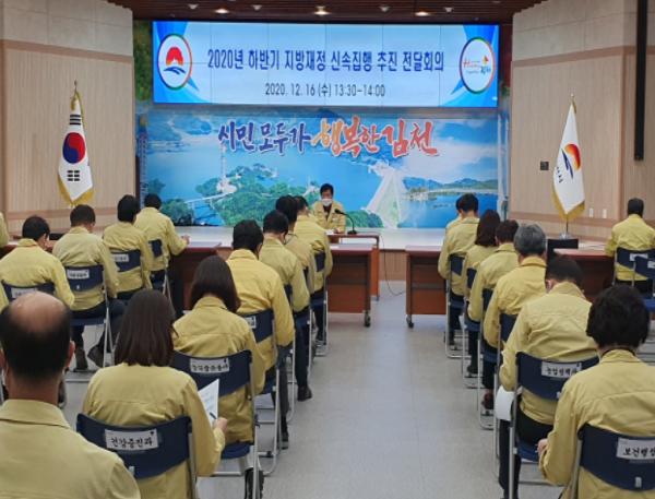 김천시 16일 2020년 하반기 지방재정 신속집행 추진 전달회의를 개최해 하반기 신속집행 현황을 점검했다고 밝혔다. 이날 점검회의에서 부시장 및 각 부서 팀장이 참석하여 하반기 신속집행 현황과 연도말 집행률 제고를 위한 대응방안 등을 집중 논의했다.