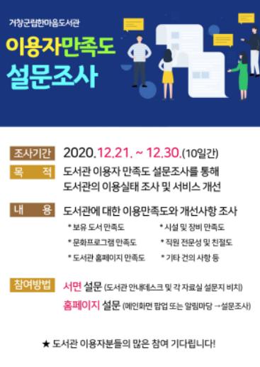 거창군립한마음도서관은 내실 있는 도서관 운영과 서비스 만족도 향상을 위해 오는 21일부터 30일까지 도서관 이용자를 대상으로 설문조사를 실시한다.