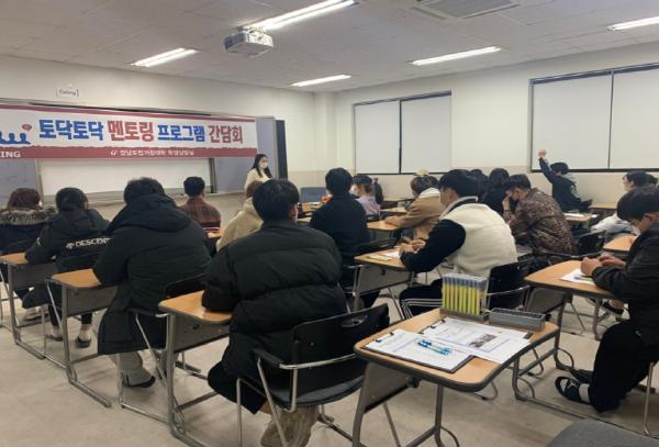 쓰담쓰담·토닥토닥 프로그램의 사전/사후 검사를 비교해보면 대인관계 자신감이 11%, 학업지속 의향이 11% 향상되어 경남도립거창대학 학생상담실에서 운영한 멘토링 프로그램이 효과를 나타냈다.