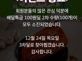 지난 10일 처음 시작해 내년 1월 28일까지 진행되는 이벤트로 1회차 꿀고구마 5kg 한 박스, 17일에는 국산 포기 김치 3kg이 판매됐고 오는 24일에는 무항생제 국내산 갈비가 판매될 예정이다.