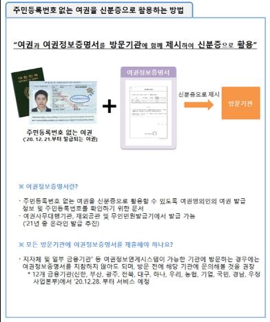 한편, 외교부는 여권에 주민등록번호가 표기되지 않더라도 국내에서 여권을 계속 신분증으로 활용할 수 있도록 여권정보증명서 발급 등의 보완책을 동시에 시행하며, 지자체 및 일부 금융기관 등에서는 여권정보증명서 없이 여권만을 제시하더라도 외교부의 여권정보연계시스템을 통해 신분확인이 가능하도록 조치할 예정이다.