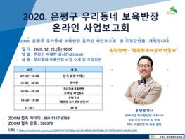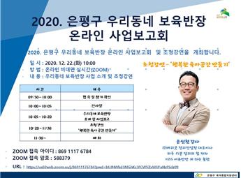 은평구는 2020년 출산가정과 영유아 가정을 초청하여 12월 22일 화요일 10시부터 11시 30분까지 온라인 사업보고회 및 초청 강연을 실시한다.