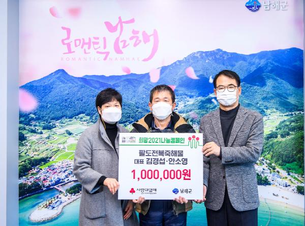 17일 미조면 소재 팔도전복죽해물 김경섭·안소영 대표와 이동면 이장단은 군수실을 찾아 이웃돕기 성금으로 각각 100만원을 기탁했다.