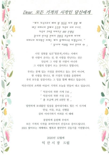 익산시는 연말을 맞아 한 해 동안 지역주민 복지증진을 위해 기부활동에 참여한 착한가게와 착한가정에 감사서한문을 발송했다.