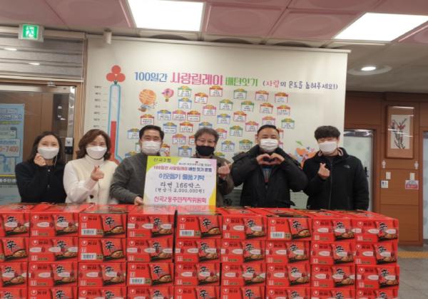 의정부시 신곡2동 주민자치위원회는 12월 17일 100일간 사랑릴레이 배턴 잇기 운동에 동참하여 라면 166상자를 기탁했다. 이번 후원물품은 코로나19 장기화로 경제적인 어려움을 겪는 이웃들에 조금이라도 보탬이 되고자 위원회의 자발적인 모금으로 마련되었다.
