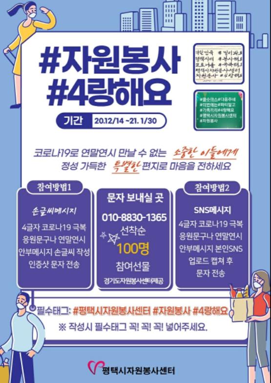 이번 캠페인은 오는 2021년 1월 30일까지 진행되며 페이스북, 인스타그램, 밴드 등의 각종 SNS를 통해 참여할 수 있고 캠페인에 참여한 SNS활동 인증사진이나 손글씨 등의 작성내용을 평택시자원봉사센터로 전송하면 된다.