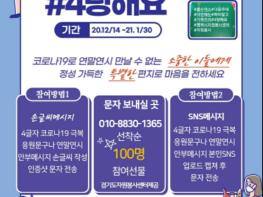4글자 응원캠페인은 심리적 방역캠페인의 일환으로 코로나19로 인해 멀어진 공동체의 사회적 거리를 좁히고 심리적 불안을 해소하고자 힘이 되는 격려의 말과 칭찬을 4글자의 메시지로 다양하게 작문하고 SNS를 통해 교감하는 캠페인이다.