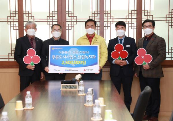평택시 푸른도시사업소 산림녹지과는 지난 17일 평택시청 대외협력실에서 지역사회 소외계층을 위해 이웃돕기 성금 250만원을 전달했다.