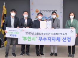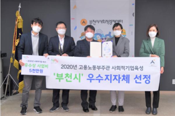 부천시가 2020년 사회적기업 발굴 및 육성 우수 지방자치단체로 선정되어 고용노동부 장관상을 수상했다.