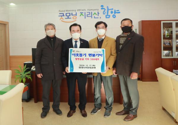 함양군은 17일 오전 함양로타리클럽 노시태 회장 외 2명이 군청을 방문해 방한용품 100세트를 기탁했다고 밝혔다.