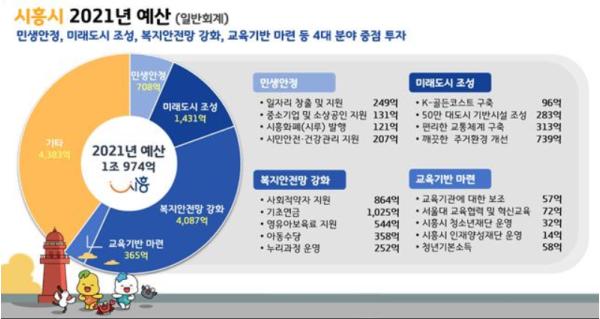 우선, 경제회복 활력 제고를 위한 지속 가능한 일자리 마련을 위해 △신중년 경력형 일자리 사업 25억 원 △시흥형 일자리 은행제 11억 원 등 249억 원을 편성했으며, 중소기업 및 소상 공인 지원을 위해 △시흥화폐(시루) 발행 121억 원 △시흥형 강소기업 육성 10억 원 등 252억 원을 편성했다.