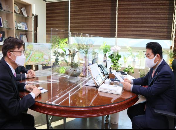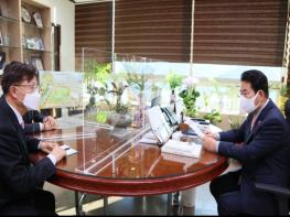 백군기 용인시장은 18일 시청 시장실에서 김재만 용인도시공사 도시사업본부장을 만나 취임 축하 인사를 전했다.