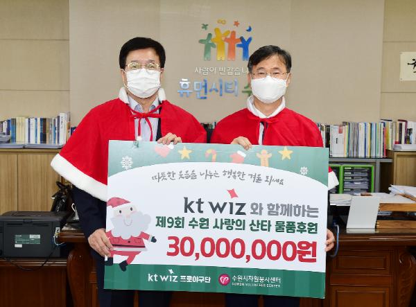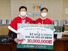 ‘kt 위즈와 함께하는 수원 사랑의 산타’는 수원시 연고 프로야구단인 kt 위즈 후원으로 6년째 이어지고 있다. 지난해까지는 kt 위즈 선수단 팬 사인회와 축하공연, 후원물품 전달식 등 ‘산타 출정식’이 있었지만, 올해는 많은 사람이 모이는 행사 없이 비대면으로 진행했다.