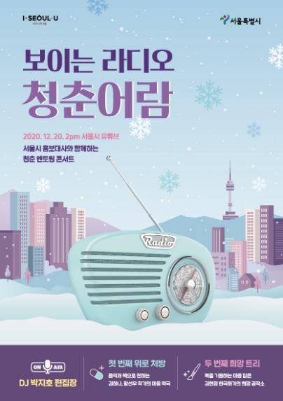 2020년, 코로나-19 확산으로 힘들고 지친 시간들을 보낸 청춘들을 위해 서울시 홍보대사가 나섰다. 서울시 홍보대사와 함께하는 청춘멘토링콘서트 '2020, 청춘어람'을 오는 12월 20일 14:00부터 16:00까지 유튜브 생중계로 개최한다.