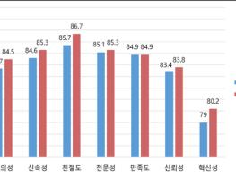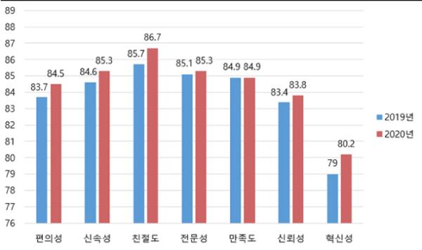 지난해 대비 전체 항목의 만족도가 동일하거나 소폭 상승했고, 그 중 ‘직원의 친절도’는 전년 대비 1점 오른 86.7점으로 가장 높은 점수를 보였다. 아울러 ‘혁신성’과 ‘편의성’이 전년 대비 각각 1.2점, 0.8점의 상승폭을 보이며 각각 80.2점, 86.7점으로 나타났다.