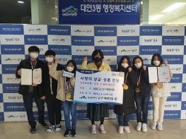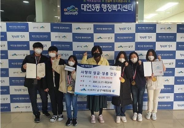 지난 12월 17일, 2020년 대한민국학생창의력챔피언대회에서 초등부 대상(상금 100만원)과 중등부 우수상(상금50만원)을 받은 학생들이 대연3동 행정복지센터를 방문하여 대회에서 받은 상금 1,500,000원을 이웃돕기성금으로 기탁했다.