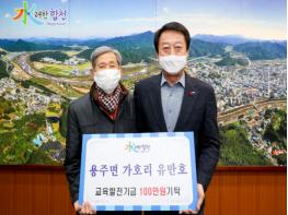 합천군 용주면 가호리 유만호씨는 18일에 (사)합천군교육발전위원회(이사장 문준희)를 방문하여 합천군 향토인재육성을 위해 써달라며 교육발전기금 1백만원을 기탁했다.