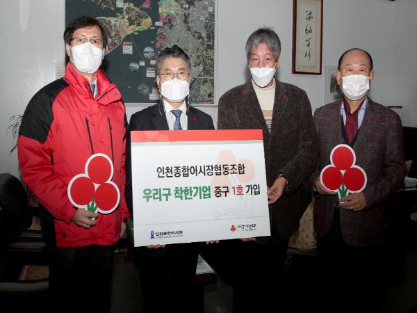 인천 중구는 지난 12월 17일 연안동지역사회보장협의체(공동위원장 이성숙·고근진), 인천사회복지공동모금회(회장 심재선)와 함께 우리 구 착한 기업 중구 1호점으로 가입한 인천종합어시장사업협동조합(조합장 유기붕)을 방문하여 현판 전달식을 진행했다.