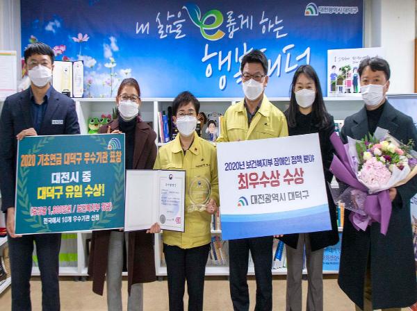 대전 대덕구는 보건복지부에서 실시한 2020년 기초연금 분야 추진사항 평가에서 ‘우수’기관으로, 2020년 지역복지사업평가 장애인정책분야에서 ‘최우수’ 기관으로 동시 선정됐다.