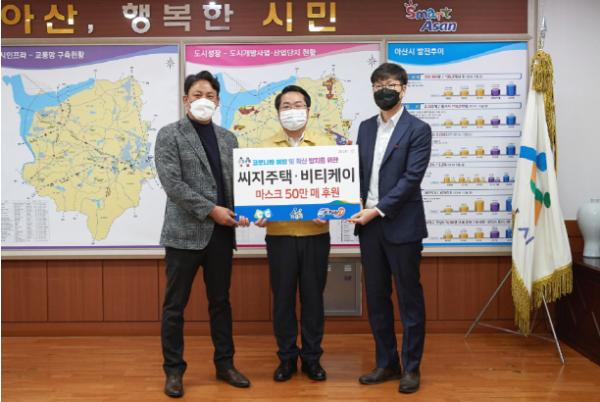 ㈜씨지주택(대표이사 김병주, 경기도 평택)과 ㈜비티케이(대표이사 김창근, 영인면)가 18일 아산시에 코로나19 극복을 위해 비말차단 마스크 50만매(성인용 40만매, 아동용 10만매)를 전달했다.