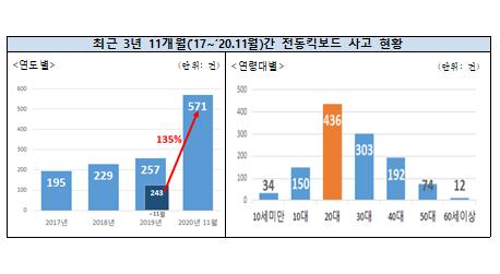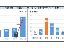 최근 3년 11개월간 소비자위해감시시스템에 접수된 안전사고는 1,252건으로 운전미숙 및 과속으로 인한 사고가 804건(64.2%)이고, 고장 및 제품불량으로 인한 사고가 393건(31.4%)으로 나타났다.