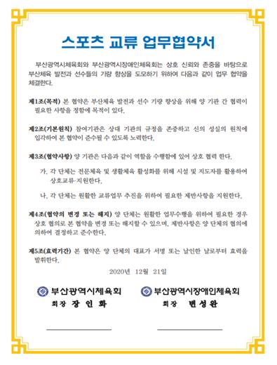 부산시는 오는 12월 21일 오후 3시 시청 국제의전실에서 부산시체육회(회장 장인화)와 부산시장애인체육회(회장 변성완 부산시장 권한대행) 간 ‘스포츠 교류 업무협약식’을 개최한다고 밝혔다.