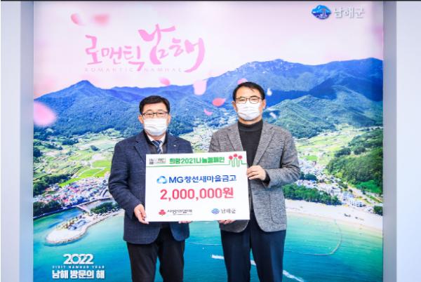 MG창선새마을금고(이사장 이정성)는 18일 군수실을 방문해 이웃돕기 성금 200만원을 기탁하며, 희망2021나눔캠페인에 동참했다.