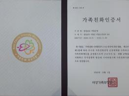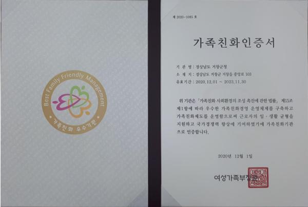 군은 최초 2015년 신규인증을 획득해 2018년 12월 가족 친화인증 유효기간 연장 이후에도 가족 친화제도를 모범적으로 추진해 왔으며, 2020년 11월까지 유효기간이 만료됨에 따라 서류심사 및 최고경영자인 군수 인터뷰를 포함한 현장심사를 거쳐 2023년까지 가족친화인증 우수기관 자격을 유지하게 됐다.