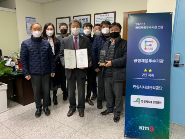 안성시시설관리공단은 한국경영인증원으로부터 2년 연속 ‘공정채용 우수기관 인증’을 획득했다고 21일 밝혔다.