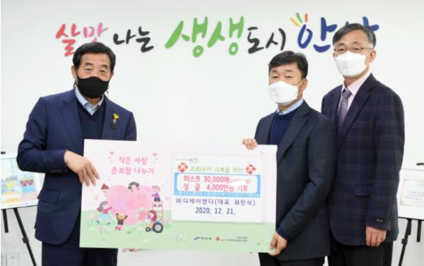 안산시는 21일 ㈜DK&D로부터 KF94 마스크 3만장과 성금 4천만 원을 기탁 받았다고 밝혔다.