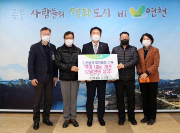 연천군 전곡5일장 상인회는 18일 연천군청을 방문하여 관내 소외계층 등 어려운 이웃에게 지원하고자 후원물품 백미 10kg 70포(250만원 상당)를 기탁했다고 밝혔다.