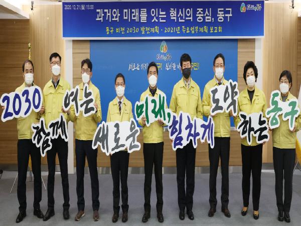 이날 행사는 코로나19 확산 방지를 위해 구청 간부 공무원들로 참석 인원을 최소화해 진행했으며, 균형발전과 혁신성장의 거점 도시를 향한 동구의 재도약을 다짐하는 퍼포먼스로 마무리됐다.
