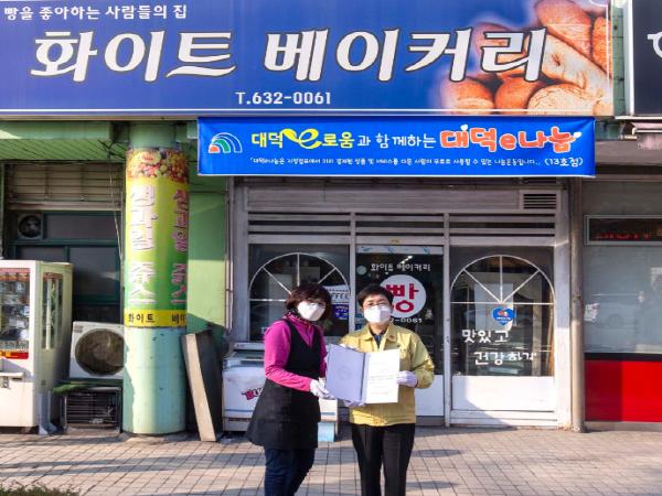 대전 대덕구는 21일 회덕동에 위치한 ‘화이트베이커리’빵집을 대덕e나눔 참여점포 13호점으로 지정하고, 선결제 나눔문화 확산을 통한 지역경제 살리기에 나섰다.