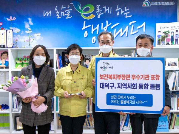 대전 대덕구는 재가 어르신을 위한 지역사회 통합 돌봄 우수기관으로 선정돼 보건복지부장관 기관표창을 수상했다고 21일 밝혔다.