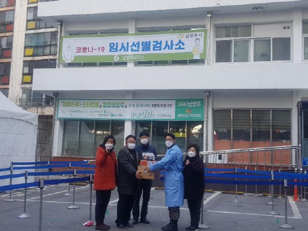 남양주시 와부읍 자율방재단(단장 김광수)은 21일 오전 와부읍 치매안심센터에 설치되어 있는 임시선별검사소를 방문해 핫팩, 생수, 컵라면 등의 40만 원 상당의 후원물품을 전달하였다.