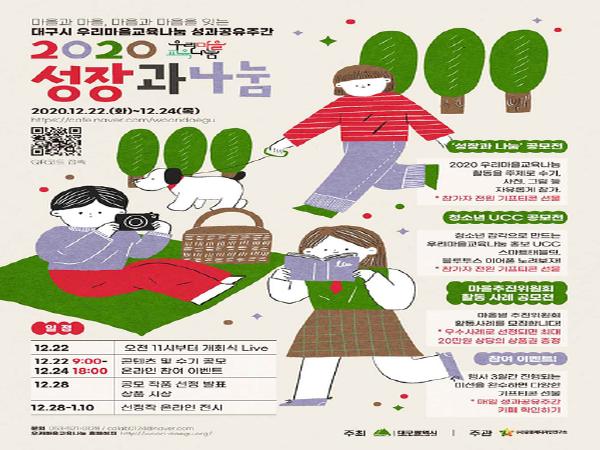 이번 온라인 성과공유주간에서는 올 한해 대구시 8개 구·군 79개 마을에서 진행된 우리마을 교육나눔사업의 성과와 우수사례, 마을별 활동성과 및 추진 경과 등을 참여 청소년 및 대구시민들과 함께 공유한다. 아울러 다양한 공모전을 진행해 참여자들의 활동 경험을 온라인 공간에서 함께 소통하며 교류할 예정이다.