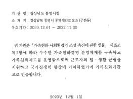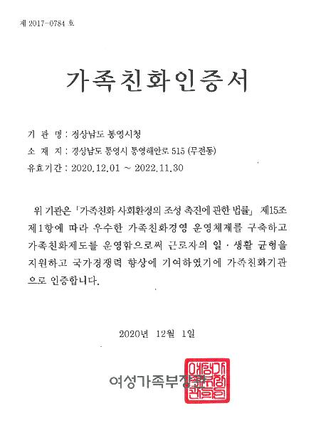 통영시청은 가족친화적 조직문화 조성 성과를 인정받아 여성가족부로부터 가족친화인증을 다시 부여받았다.