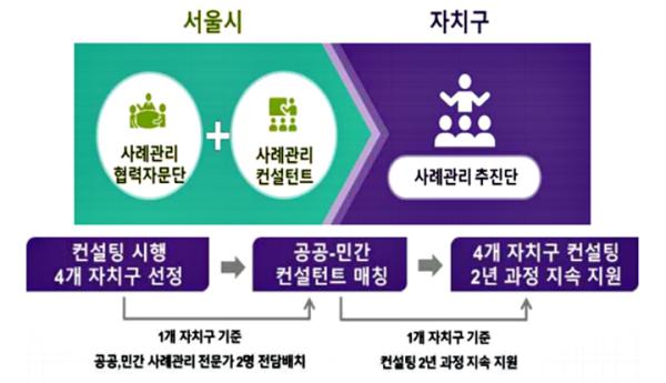 빈곤, 장애, 학대 등 복합적 복지 욕구를 가진 대상자를 지원하는 ‘통합사례관리’ 서비스의 질적 향상을 위해 학계, 공공, 민간의 전문가들로 구성된 ‘서울시 사례관리 전문 컨설팅단’ 운영을 통해 자치구별 현재 사례관리 지원 체계를 점검하고 개선 방향을 도출하였다.