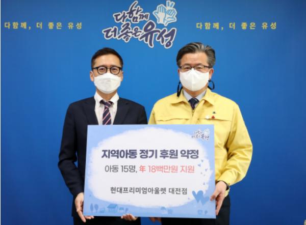 대전광역시 유성구가 22일 구청 행복사랑방에서 현대프리미엄아울렛 대전점과 관내 저소득층 아동 지원을 위한 후원 약정식을 가졌다.