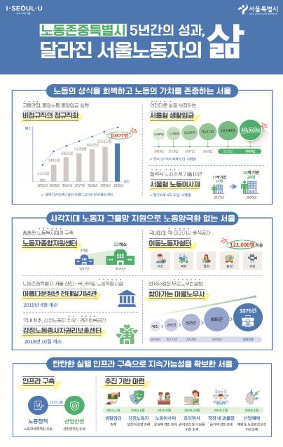 시는 지난 ’15년 ‘1차 노동정책 기본계획’ 발표 후 공공부문 비정규직 정규직 전환, 생활임금 1만원 시대, 노동이사제 도입 등 노동자의 삶을 바꾸는 핵심적인 성과를 내고 있다.
