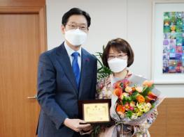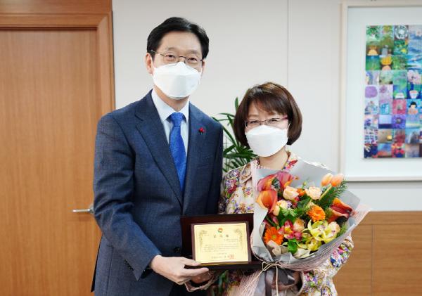 김경수 경남도지사는 22일 오후, 집무실에서 권희경 창원대학교 가족복지학과 교수에게 감사패를 수여했다.