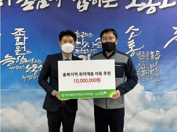충청북도공무원노동조합(위원장 이병민)은 12월 22일 성금 1천만원을 초록우산어린이재단 충북지역본부에 기탁했다고 밝혔다.