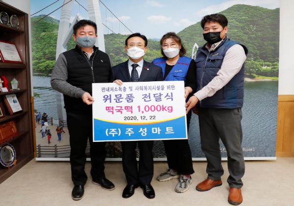 괴산 주성마트(대표 김홍래, 괴산읍 소재)가 지난 22일 괴산군청을 방문해 관내 어려운 이웃들에게 전해달라며 떡국 떡 1000㎏(300만원 상당)을 기탁했다.