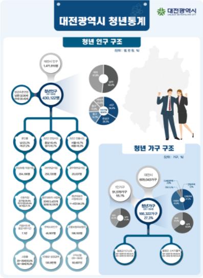 23일 대전시에 따르면 대전시 청년통계는 대전청년의 인구·가구, 주택, 건강, 복지, 일자리 5개 부문의 실태를 담고 있다.
