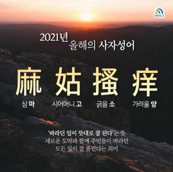 대전광역시 대덕구가 2021년 신축년 사자성어로 ‘바라던 일이 뜻대로 잘 된다’는 뜻의 마고소양(麻姑搔痒)을 선정해 발표했다.