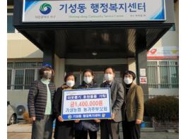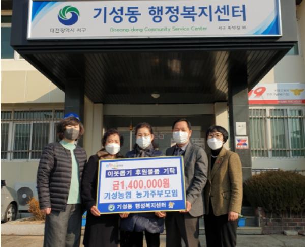 대전광역시 서구 기성동 행정복지센터는 기성농협 농가주부모임으로부터 연말을 맞아 관내 복지 사각지대 등 어려운 이웃들에게 전달해 달라며 성금 140만 원을 기탁받았다고 23일 밝혔다.