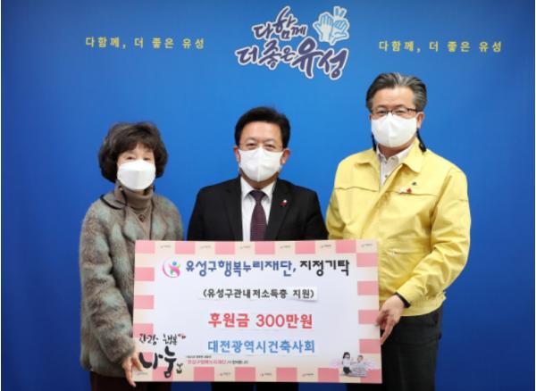 대전광역시 유성구는 23일 구청 행복사랑방에서 대전건축사회가 유성구행복누리재단에 성금 300만 원을 기탁했다고 밝혔다.