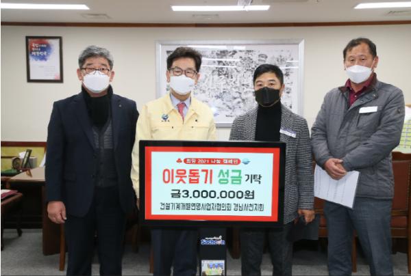 (사)건설기계 개별연명사업자협의회 경남사천지회(회장 최영철)는 지난 22일, 사천시청을 방문해 어려운 이웃에게 전해 달라며 이웃돕기 성금 300만원을 기탁했다.